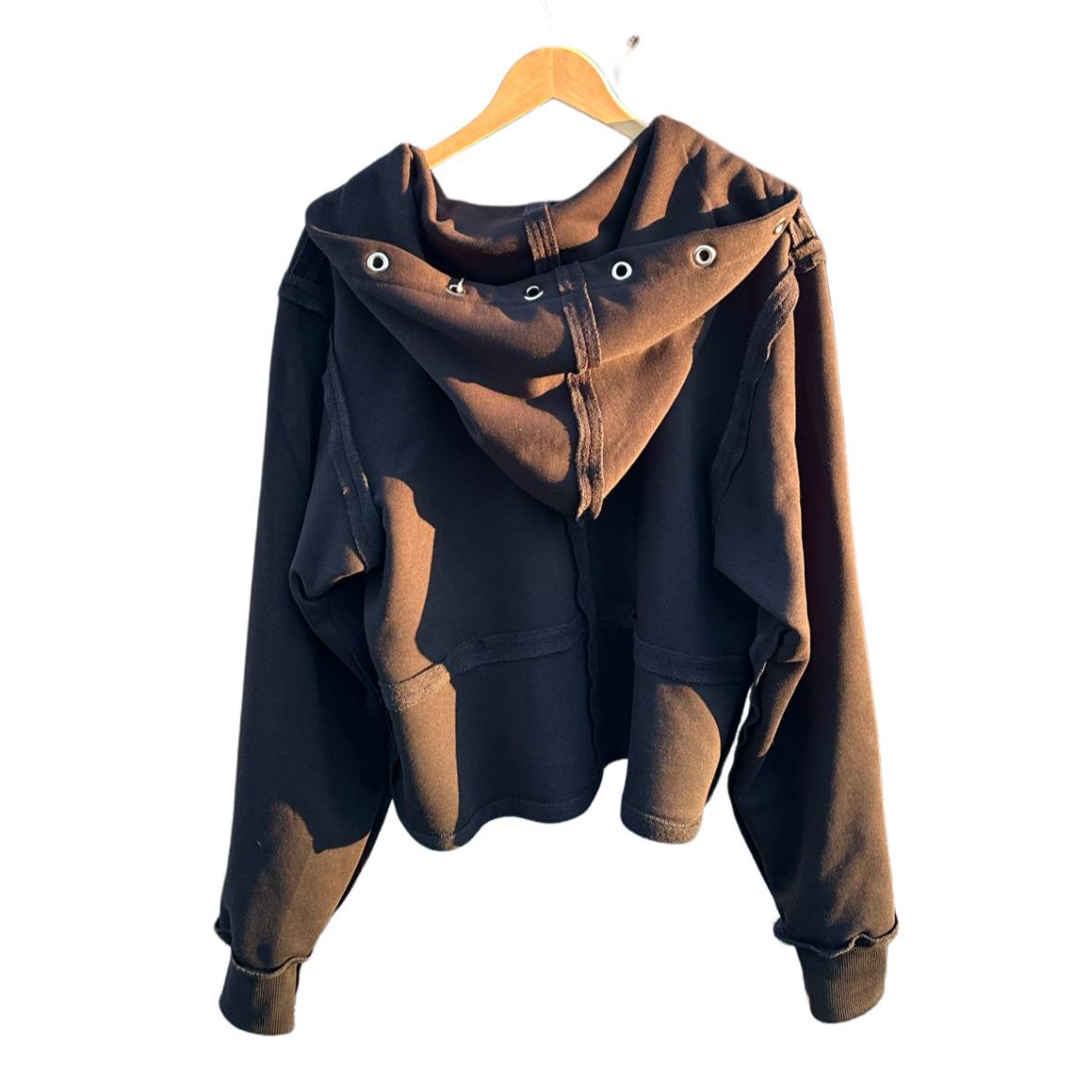 Crafted from 95% cotton, this zip hoodie showcases exposed seams throughout for an inside-out aesthetic, with the zipper prominently displayed. Metal grommets and rings accent the hood and lower pocket areas, creating a laid-back yet darkly edgy vibe.